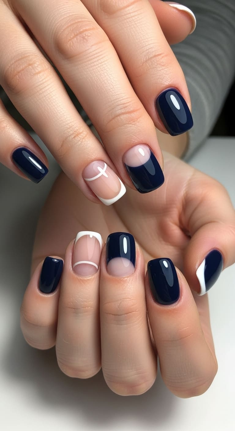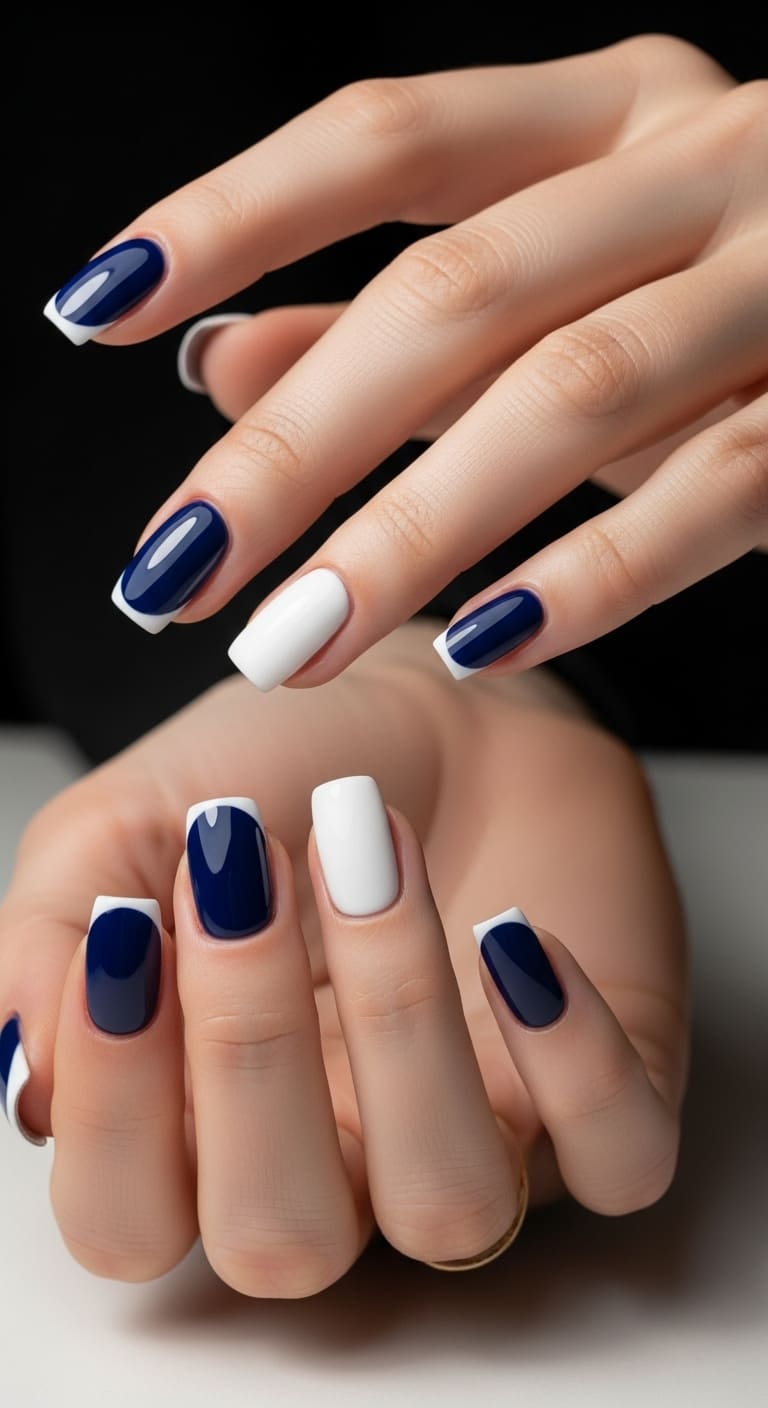 Ever stared at your nails wondering how to switch things up from your usual go-to shades? Dark blue and white might just be the sophisticated color combination you’ve been searching for.
