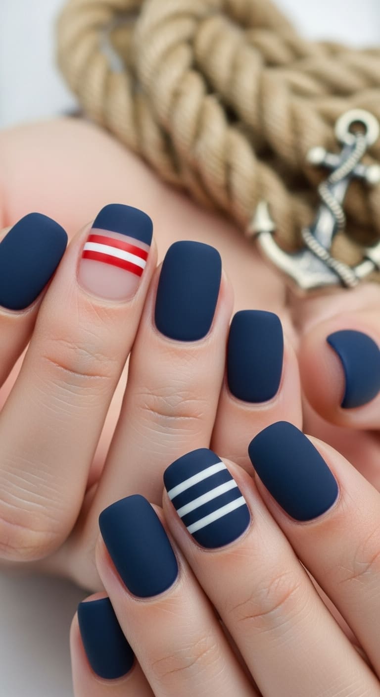 For extra dimension, try varying the stripe thickness or adding a pop of red on your ring finger to complete that sailor-inspired aesthetic.