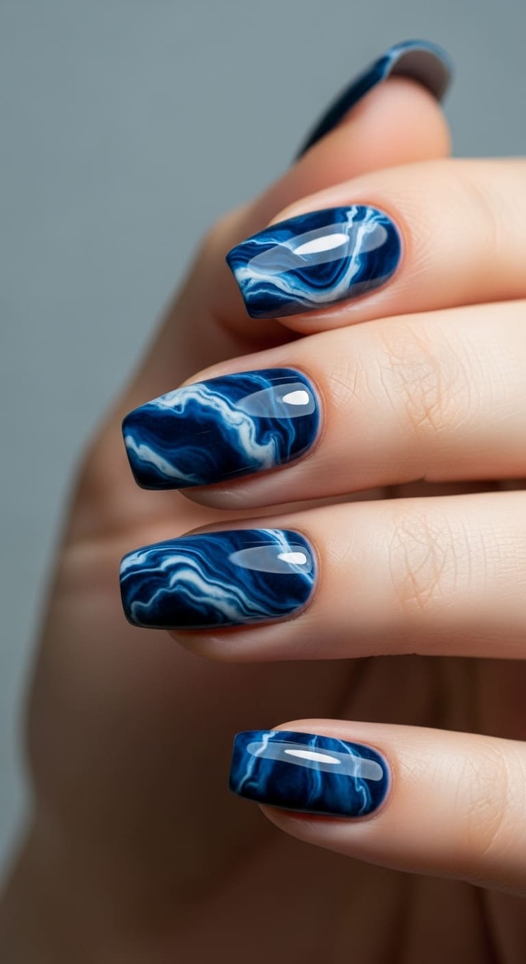 Marble nails have taken social media by storm, and the dark blue and white combination creates a dreamy, almost oceanic effect. The swirling pattern mimics natural stone while giving off an artistic, one-of-a-kind vibe that’s surprisingly easy to achieve with a bit of patience.