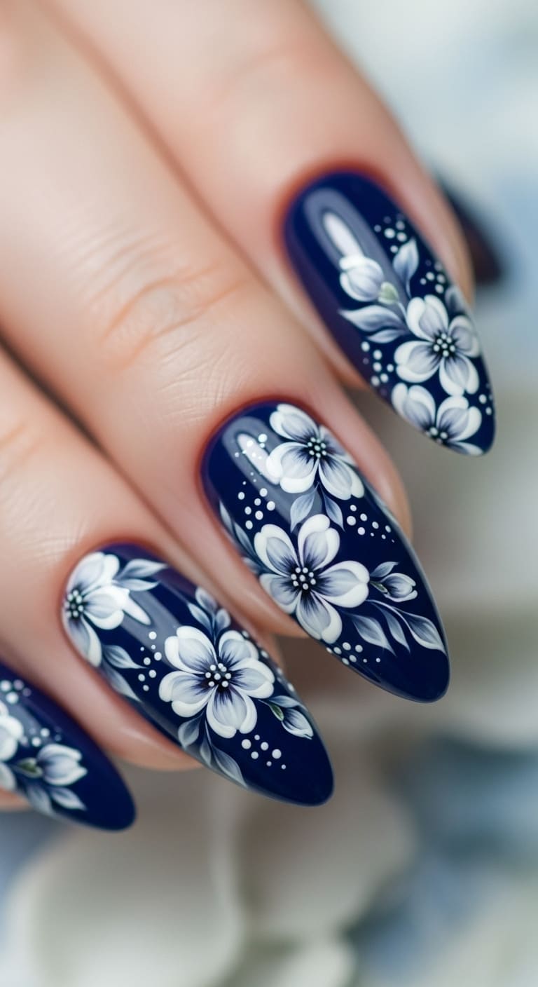 Flowers aren’t just for spring—dark blue and white floral designs work beautifully year-round and add a feminine touch without feeling overly sweet. Paint small white flowers on a navy base for a dainty, romantic look, or reverse it with navy blooms on white nails for something bolder.