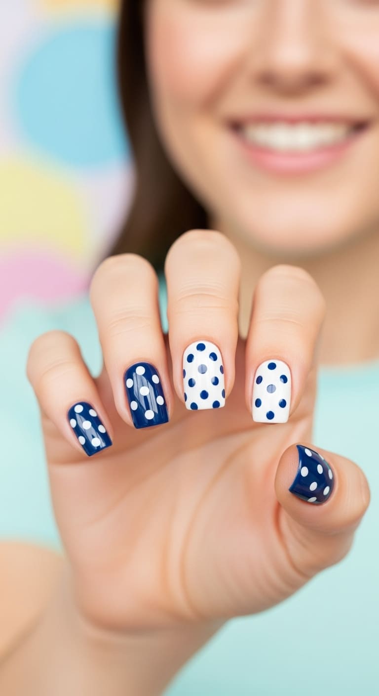 Sometimes you need a manicure that makes you smile, and cheerful polka dots deliver exactly that mood-boosting energy. A dark blue base with white dots feels classic and retro, while white nails with navy dots lean more fresh and contemporary.