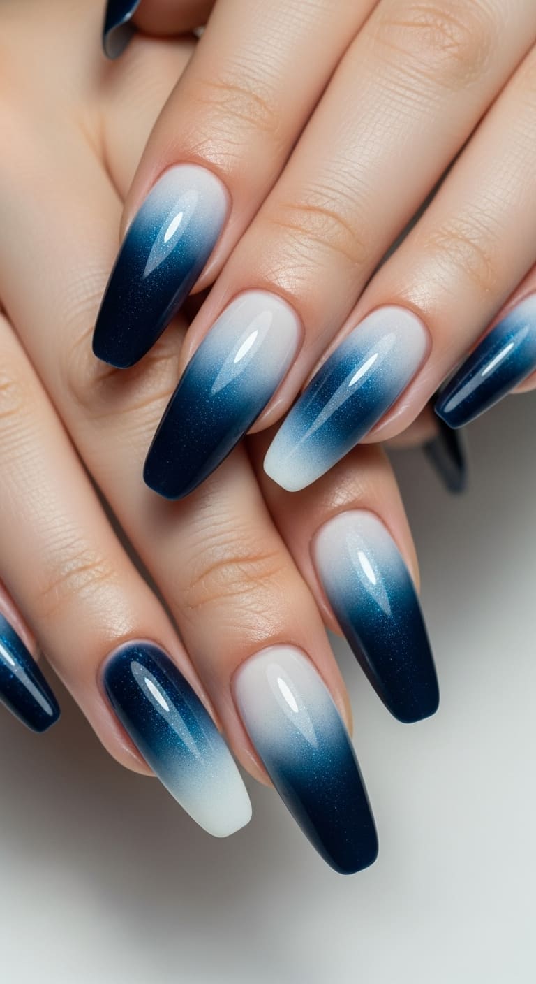 The gradual transition from dark blue to white creates a stunning gradient effect that’s both eye-catching and surprisingly wearable. This technique works horizontally across each nail or vertically from nail to nail across your hand, giving you options depending on your preferred level of drama.