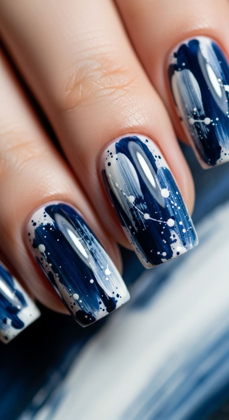 For those who appreciate artistic, editorial-worthy nails, abstract brush strokes in dark blue and white offer maximum impact with an effortlessly cool vibe. This freeform design lets you channel your inner artist with sweeping strokes, splatters, and organic shapes that feel gallery-inspired.