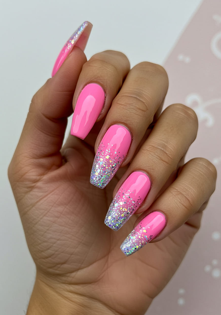 Want something playful and eye-catching? A bright bubblegum pink base paired with a holographic glitter fade brings all the fun.