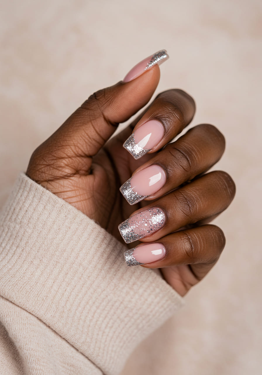 A modern twist on a French manicure, blush pink nails with silver glitter tips create a clean yet festive vibe.