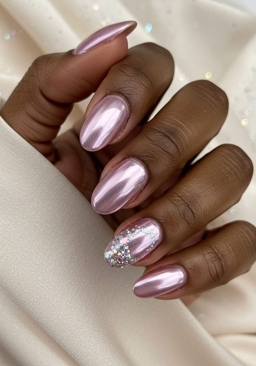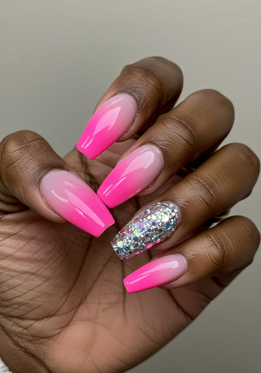 Blend soft pink into a deeper magenta for the ombré, then pick one nail (like the ring finger) and coat it in chunky silver or iridescent glitter. This combo adds contrast and drama without overwhelming the whole manicure.