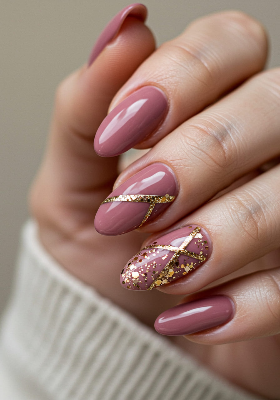 Chic and editorial, dusty rose nails with a touch of negative space look fashion-forward and refined. Create diagonal or geometric gaps in the polish and line them with ultra-fine gold or champagne glitter.