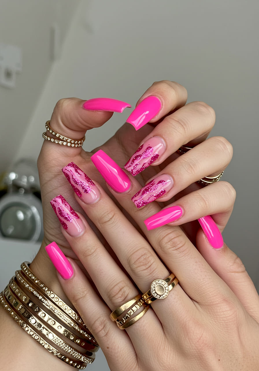 Channel your inner diva with hot pink nails featuring pink glitter flames.