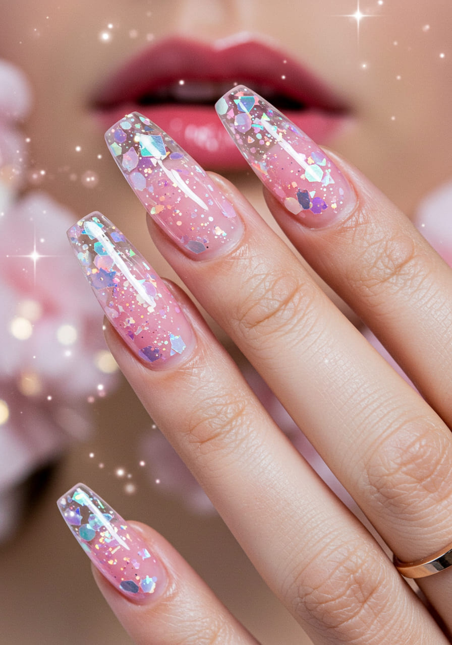Transparent pink jelly nails offer a juicy, playful base for suspended glitter. Add iridescent or fairy dust-style glitter pieces between sheer coats to create a floating, layered look.