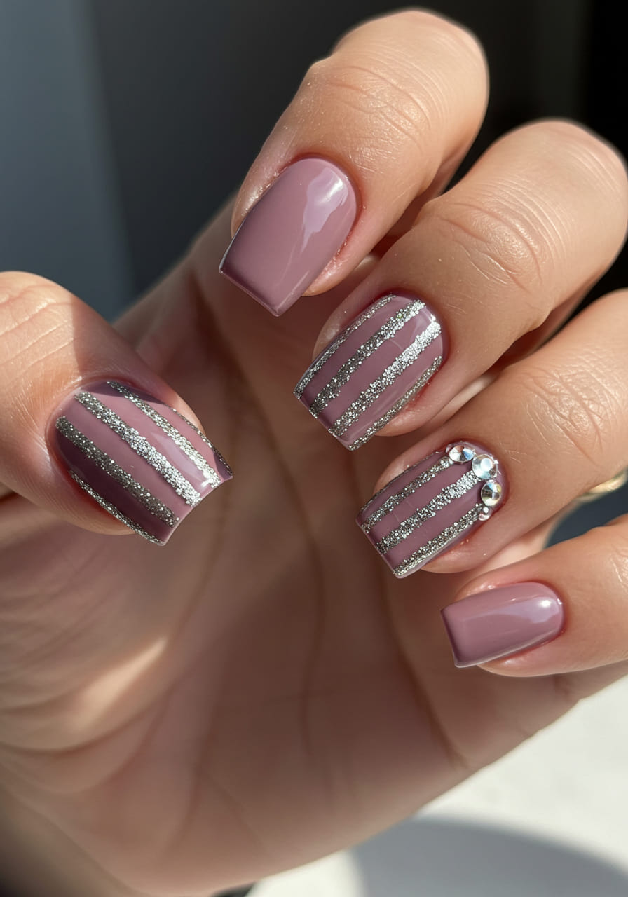 9. Mauve Pink with Rhinestones and Glitter Stripes