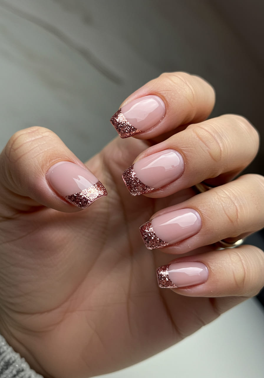 1. Soft Baby Pink with Rose Gold Glitter Tips
