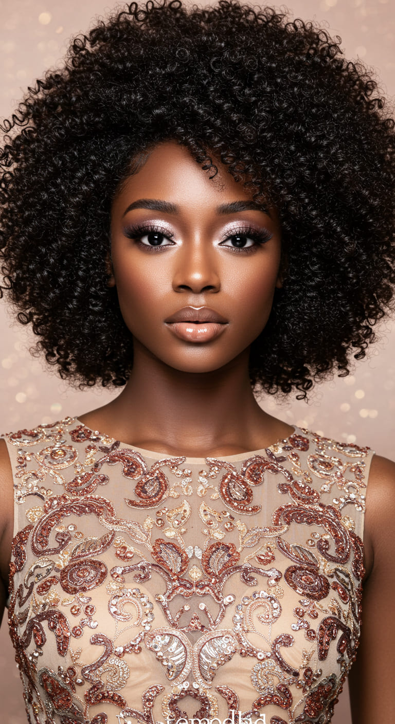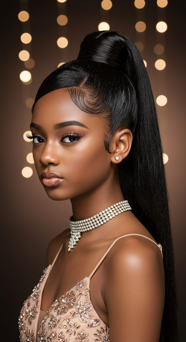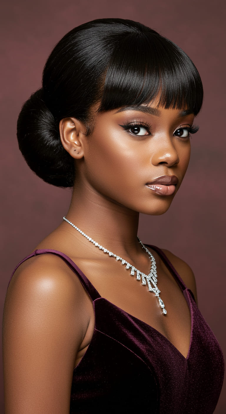 Perfect for relaxed or silk-pressed hair, it pairs beautifully with glam gowns or bodycon dresses. Use holding gel for the swoop and bobby pins to keep everything in place through the night.