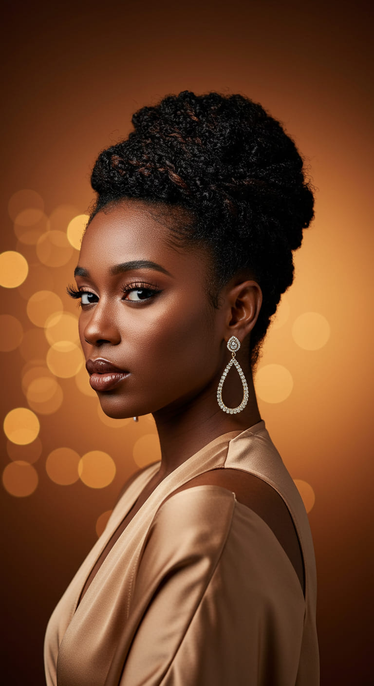 Great for medium-length or stretched natural hair, this style looks stunning with statement earrings. Secure each twist with pins and finish with a shine mist for a soft, radiant look.
