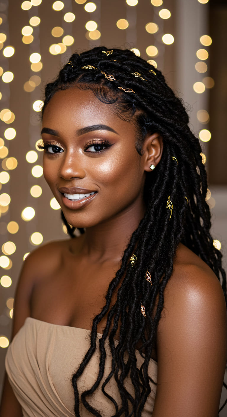 This look works well with strapless dresses and adds a unique edge to your outfit. Lay your edges with gel and pin the locs to one side for a secure, all-night-ready finish.