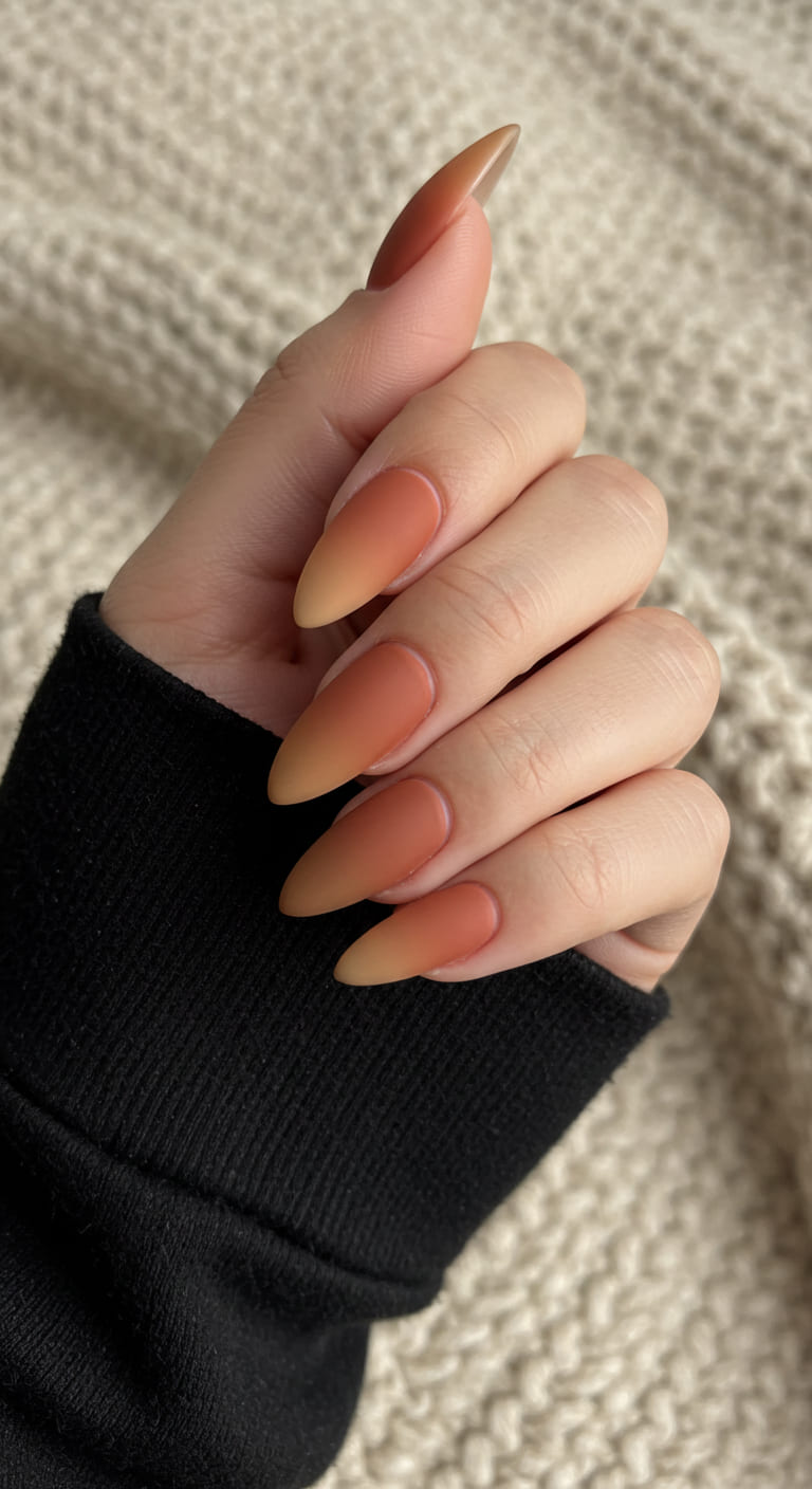 This gradient design melts soft caramel into deeper toffee tones in a seamless ombré blend. The matte finish keeps things modern and muted, perfect for fall or cozy neutral outfits.