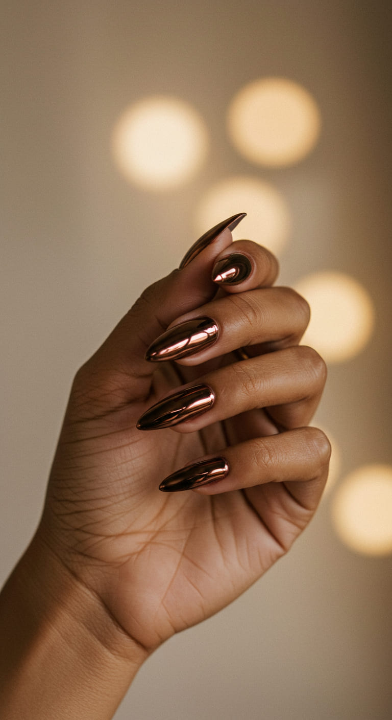 Enter full-on futuristic glam with a metallic brown chrome finish. This style catches the light with every movement, giving your nails a molten bronze glow.