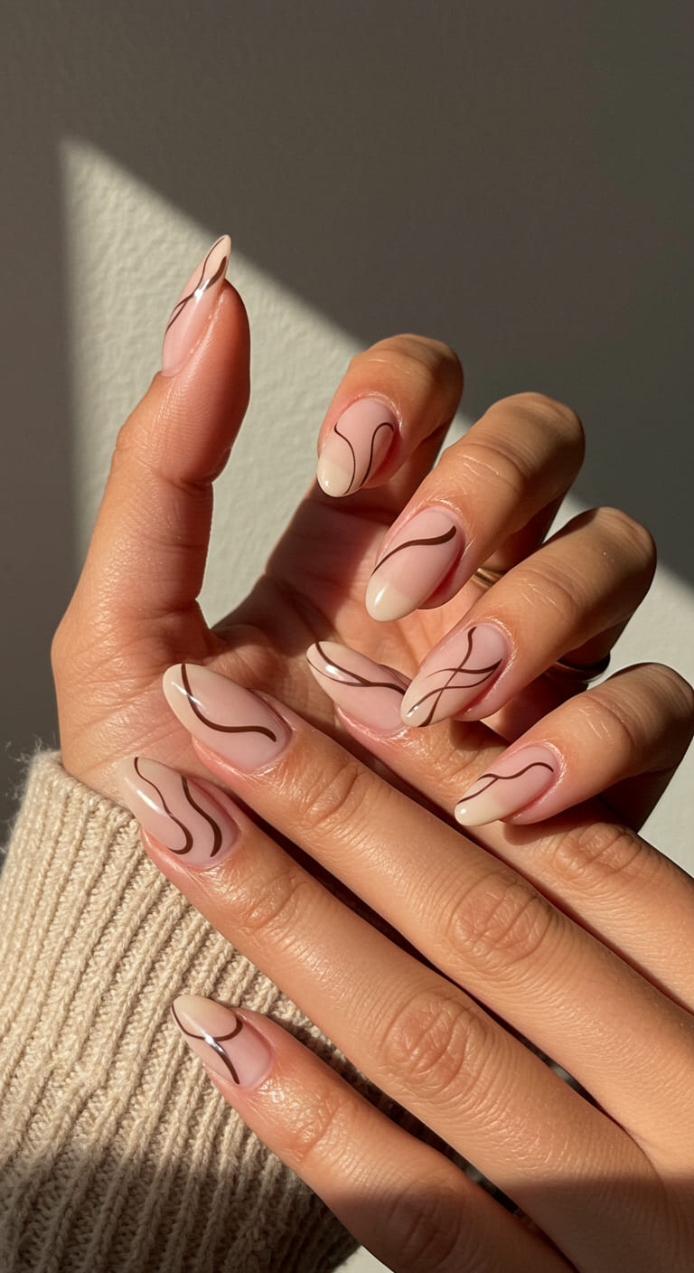 Love a clean, artsy look? Try a nude-brown base with fine mocha brown linework—think swoops, micro swirls, or negative space curves.