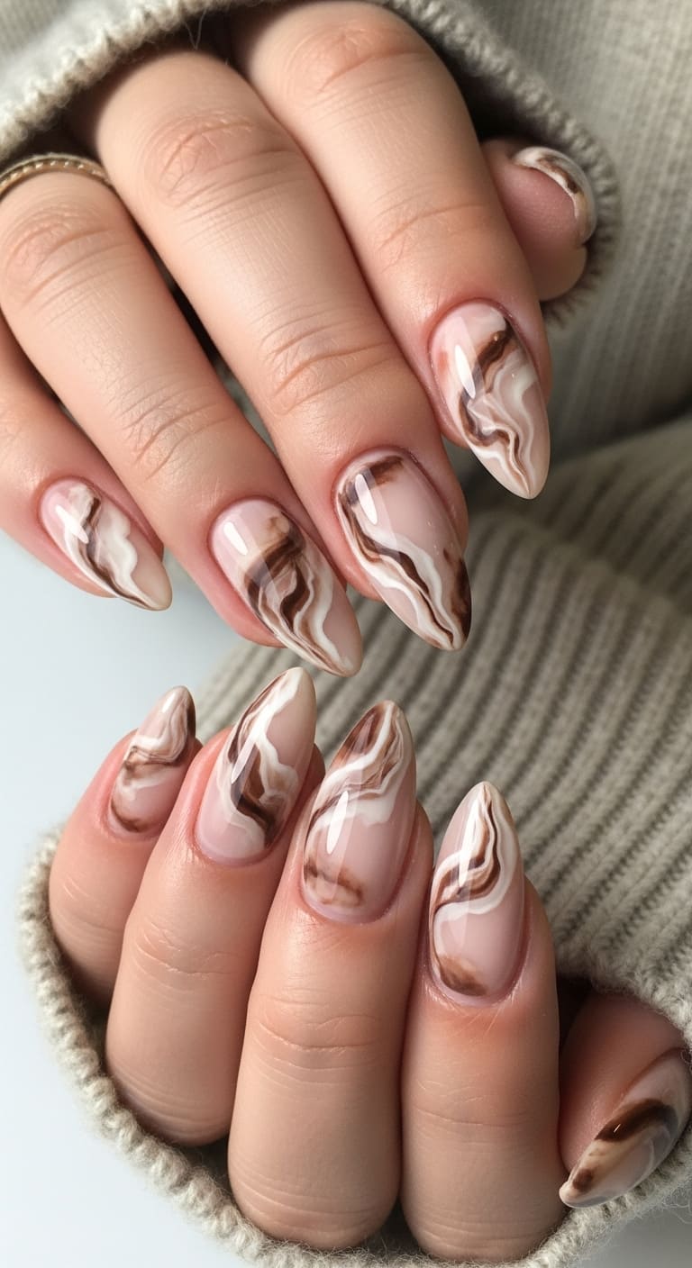 Marbled brown nails blend light latte tones with cream and espresso shades for an elegant, organic look. Each nail becomes its own unique swirl of art—no two the same.