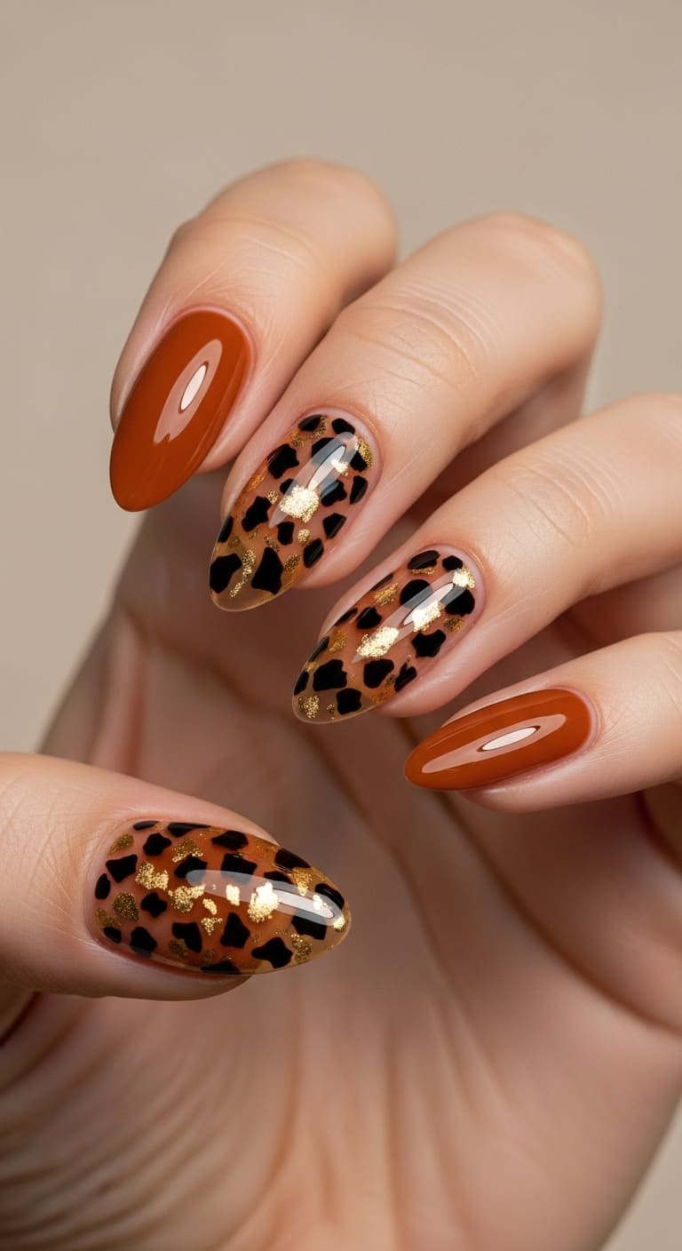 Use it as an accent on one or two nails, paired with a solid warm brown on the rest for a balanced, editorial finish. This look feels fashion-forward but still wearable, making it ideal for those who love statement styles with a classy edge.
