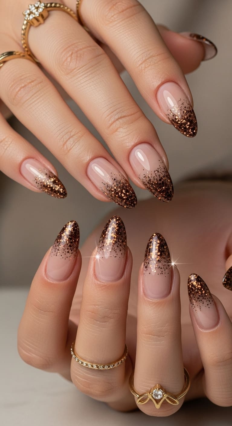 Take the French manicure up a notch with brown glitter tips over a sheer nude base. Use a fine espresso glitter polish and concentrate it on the tips, blending it downward for a soft fade.