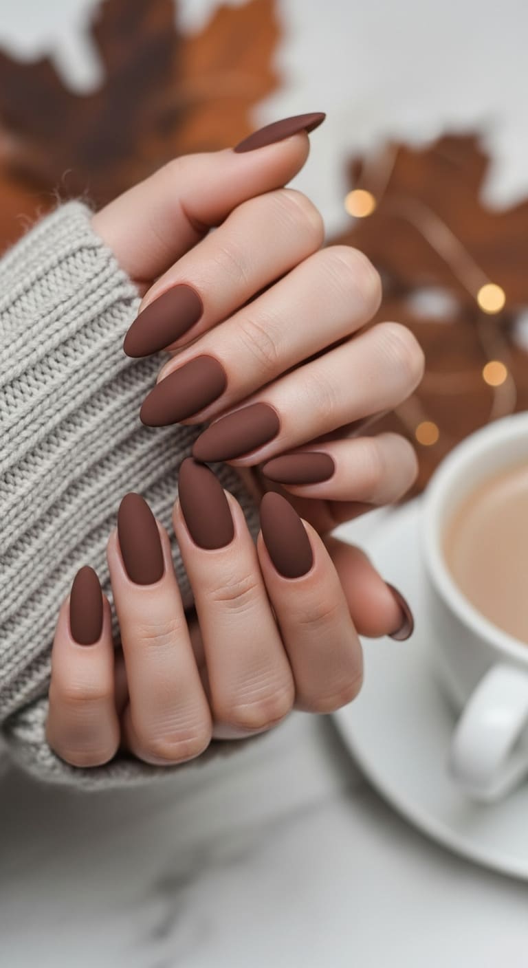 Nothing says fall like a soft matte mocha finish. This look features a rich, warm brown gel polish in a matte top coat, giving your nails a cozy, velvety vibe.