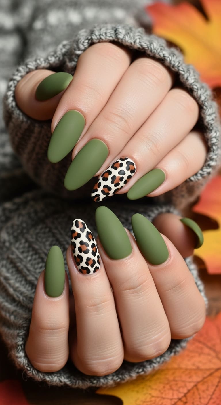Olive green matte nails get a fun fall twist with accent nails featuring leopard spots in brown and black. The earthy tones keep it seasonal, while the animal print adds a playful edge.