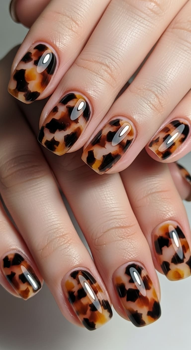 Tortoiseshell nails combine amber, black, and golden tones in a marbled effect that’s both trendy and fall-appropriate.