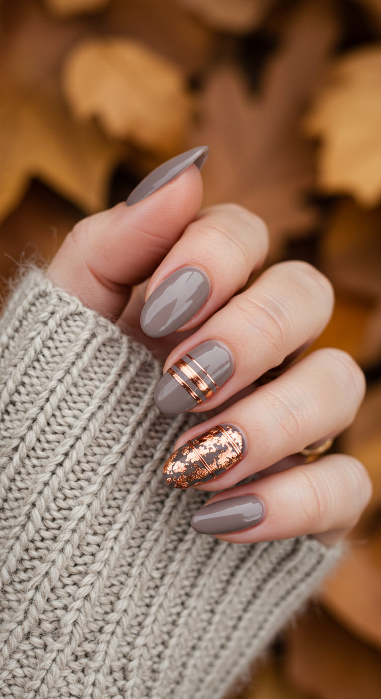 Create a modern contrast by pairing a taupe gel base with metallic copper accents. Use copper foil or gel polish to add stripes, dots, or half-moon details.