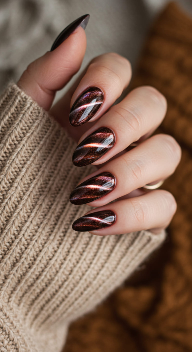 This gel polish features magnetic particles that create a “cat eye” effect—a luminous line that moves with the light. In a deep espresso shade, it gives off mysterious autumn vibes.