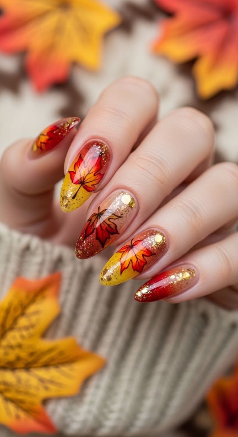 Bring the beauty of fall foliage to your fingertips with delicate maple leaf nail art. You can go full hand-painted for a more detailed look or use nail decals for convenience.
