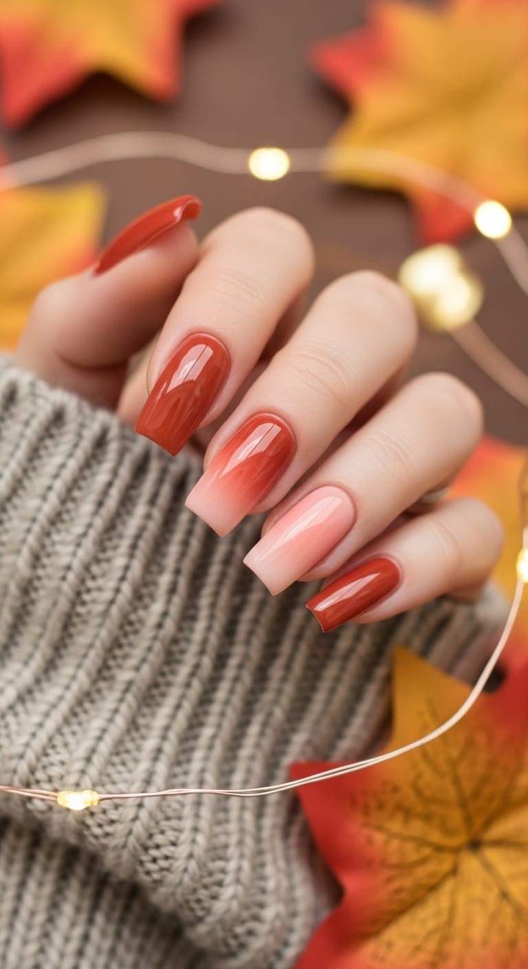 Capture the essence of falling leaves with a burnt orange ombré design. This fade effect transitions from a deep terracotta to a soft peach, making your nails look like mini autumn sunsets.