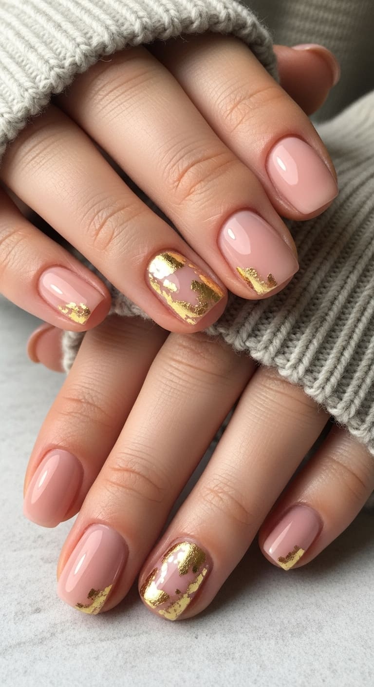 If you love minimalist elegance, nude nails with delicate gold foil accents are a stunning choice. The neutral base makes the metallic flecks pop, offering a classy yet seasonal sparkle.