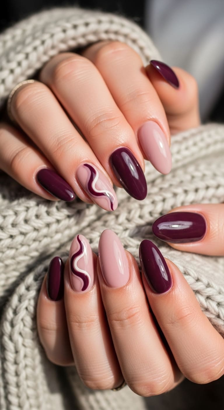 Deep plum paired with soft mauve makes for a beautifully moody gel manicure. Alternate the colors on each finger or go for abstract swirls for a more artistic take.