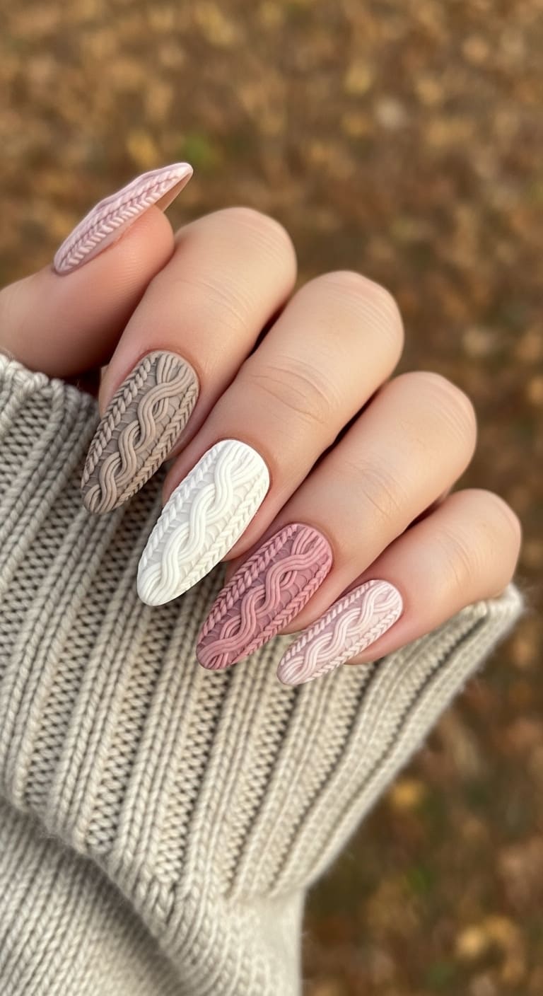 Stick to neutral tones like cream, taupe, or dusty rose for a soft, seasonal aesthetic. Great on medium-length nails to show off the texture.