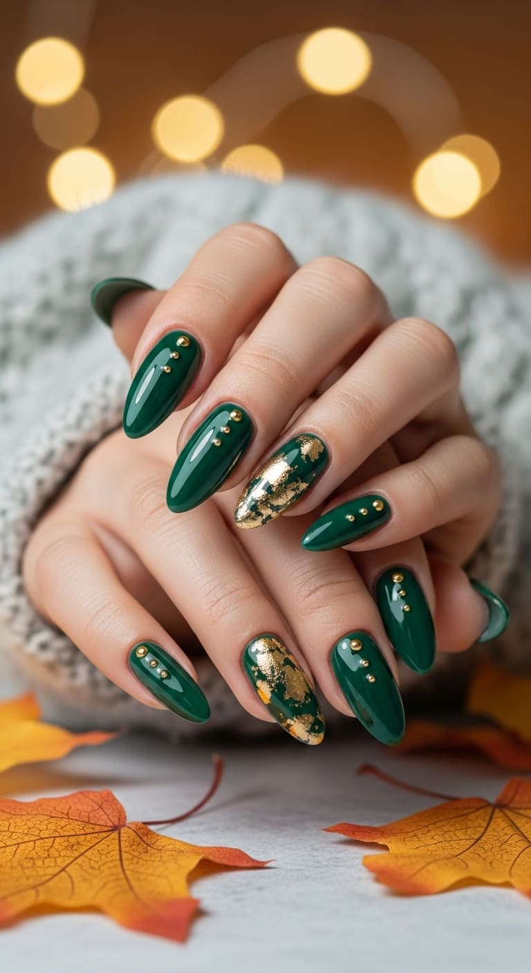 Rich forest green nails with tiny gold studs or foil create a luxurious, earthy look. This color combo is bold yet wearable, and the shimmer gives it a festive fall touch.