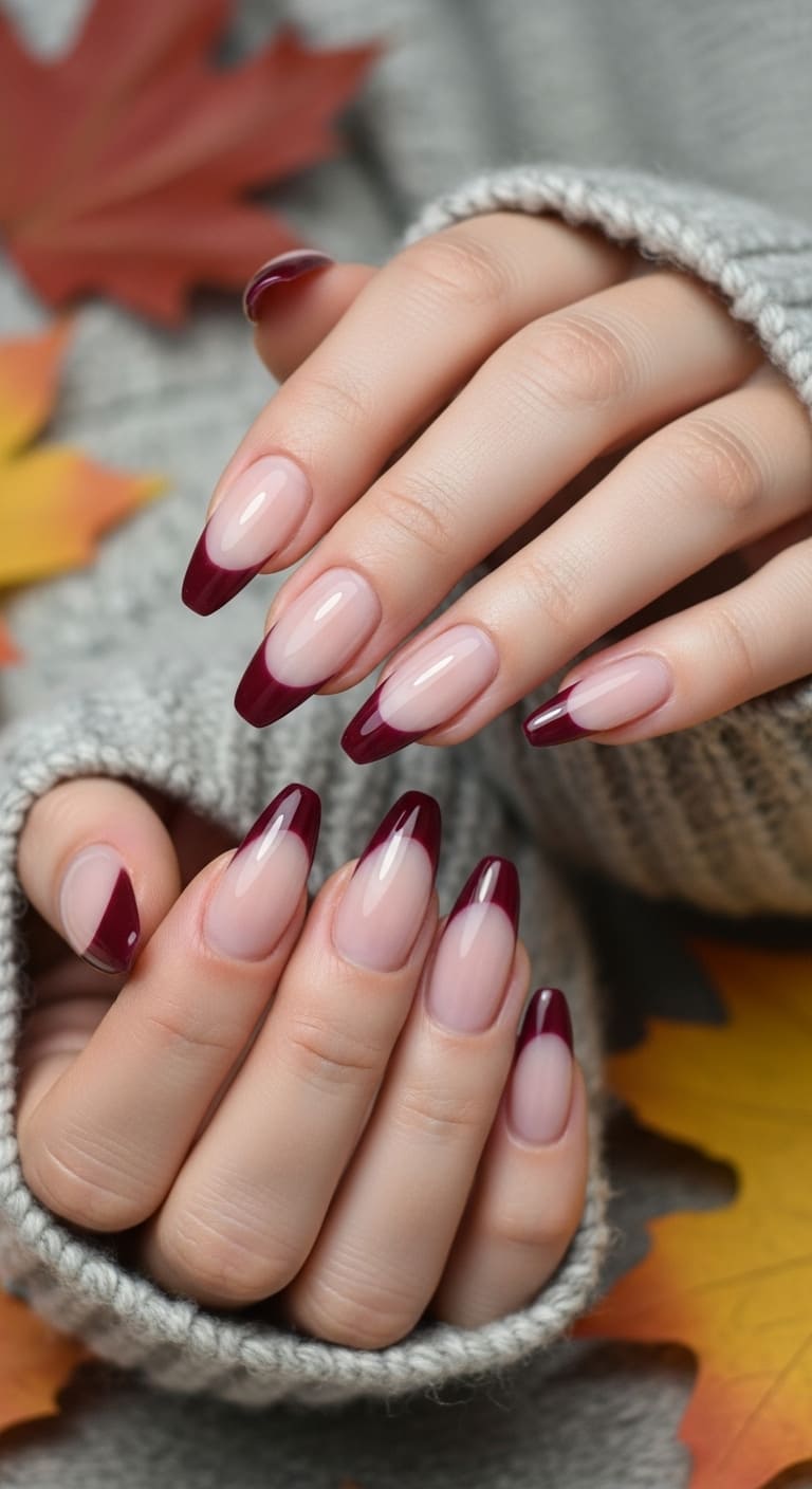 A twist on the classic French manicure, burgundy tips bring autumn sophistication to your fingertips. Pair with a sheer pink or nude base for contrast.
