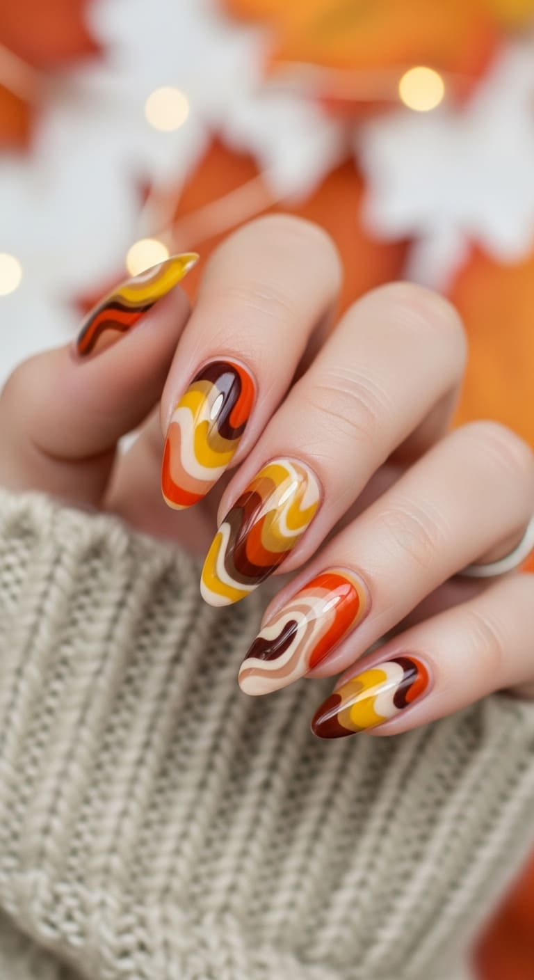 Blend warm shades like mustard, burnt sienna, and deep brown into swirled, abstract gel art. Each nail becomes a unique mini canvas.