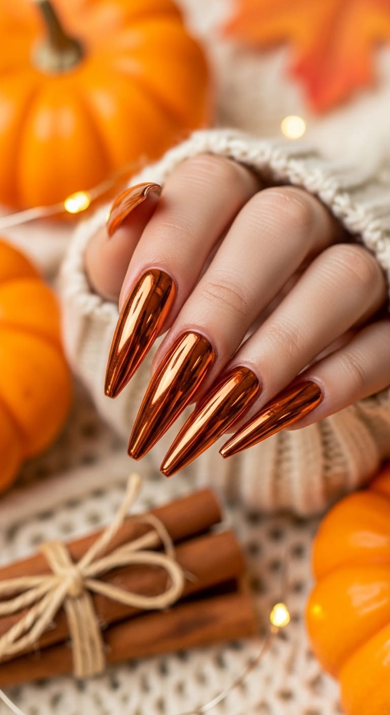 Spice up your fall mani with a shimmering pumpkin-toned chrome finish. This metallic look catches the light beautifully and feels festive without being over the top.