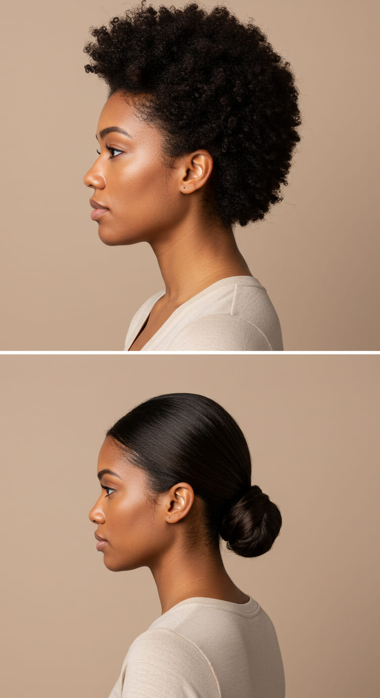 This one’s a staple for textured hair! Slick your natural curls into a low puff with a bit of edge control, or twist into a low bun for a sleeker finish.