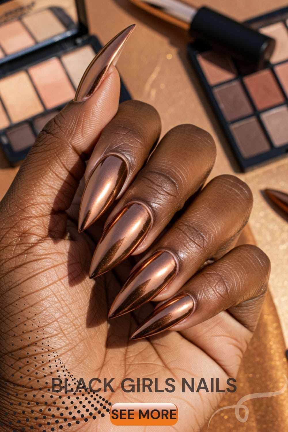 Add a futuristic twist to your fall nails with a reflective chrome bronze finish. This bold, shimmery look works great for special occasions or when you want to make a statement.