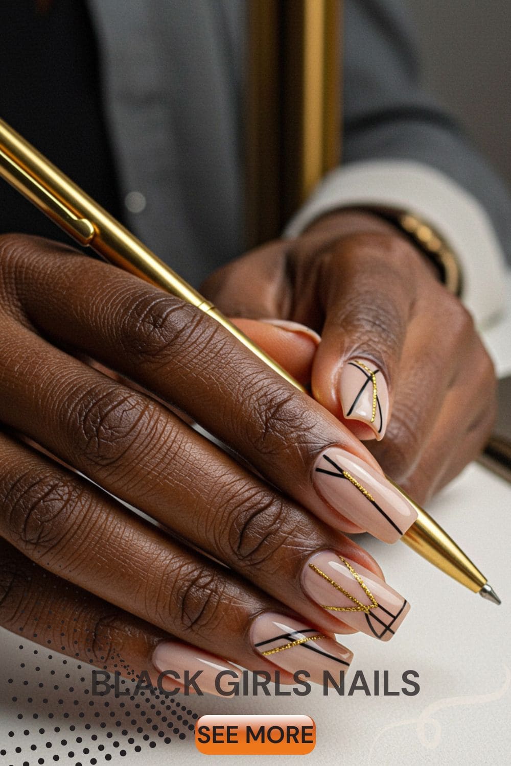Try soft beige or sandy nude nails decorated with clean black or gold geometric designs. This combo is equal parts modern and minimal.