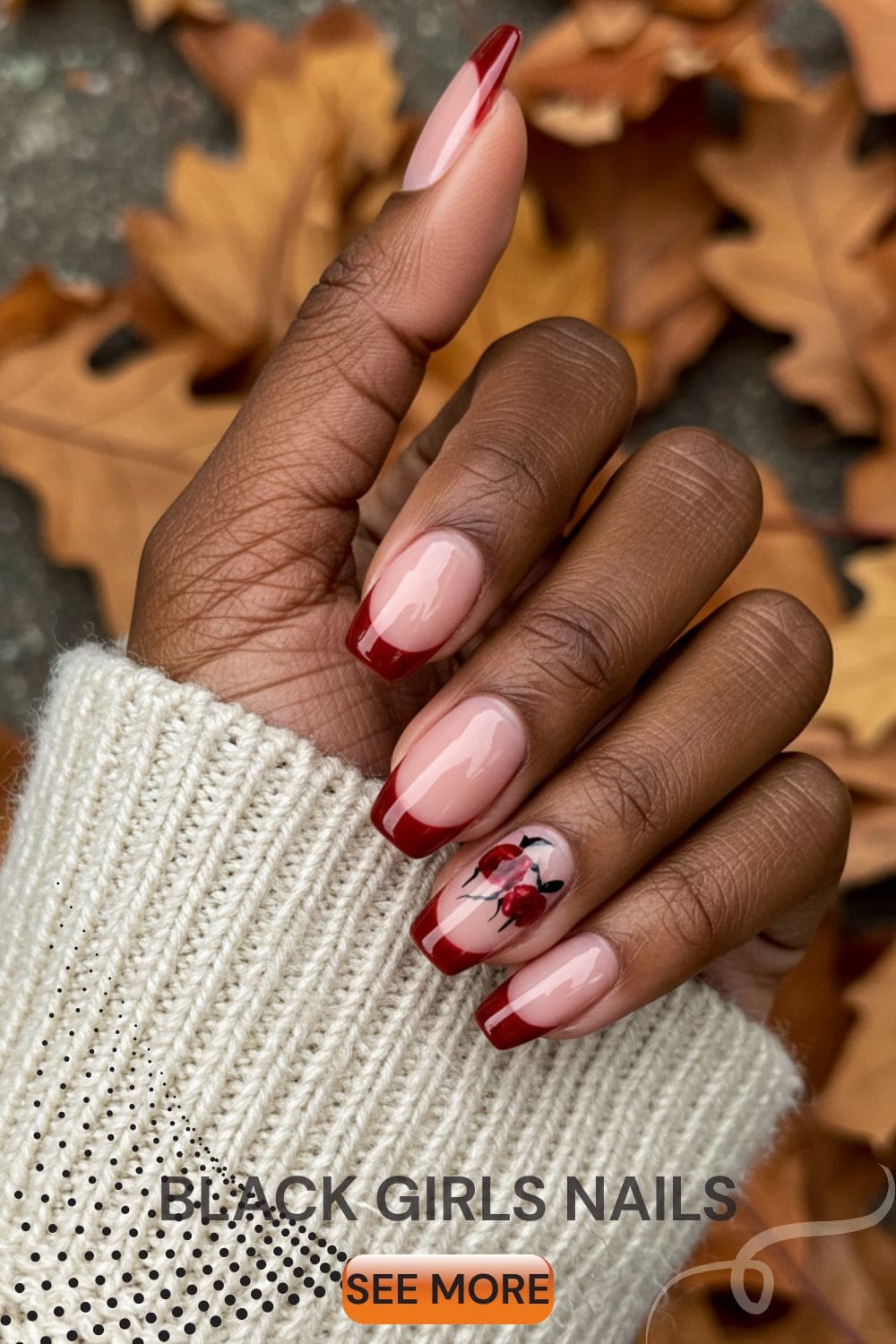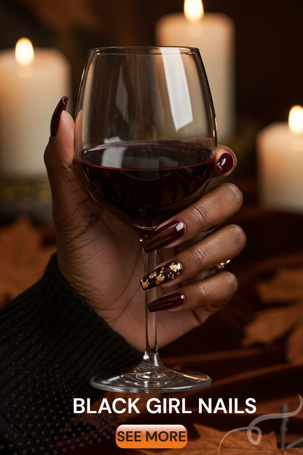 Deep wine reds are always a fall staple, but adding gold foil accents elevates the look to luxury status. The gold pops beautifully against melanin-rich hands, making this combo ideal for everything from date nights to holiday parties.