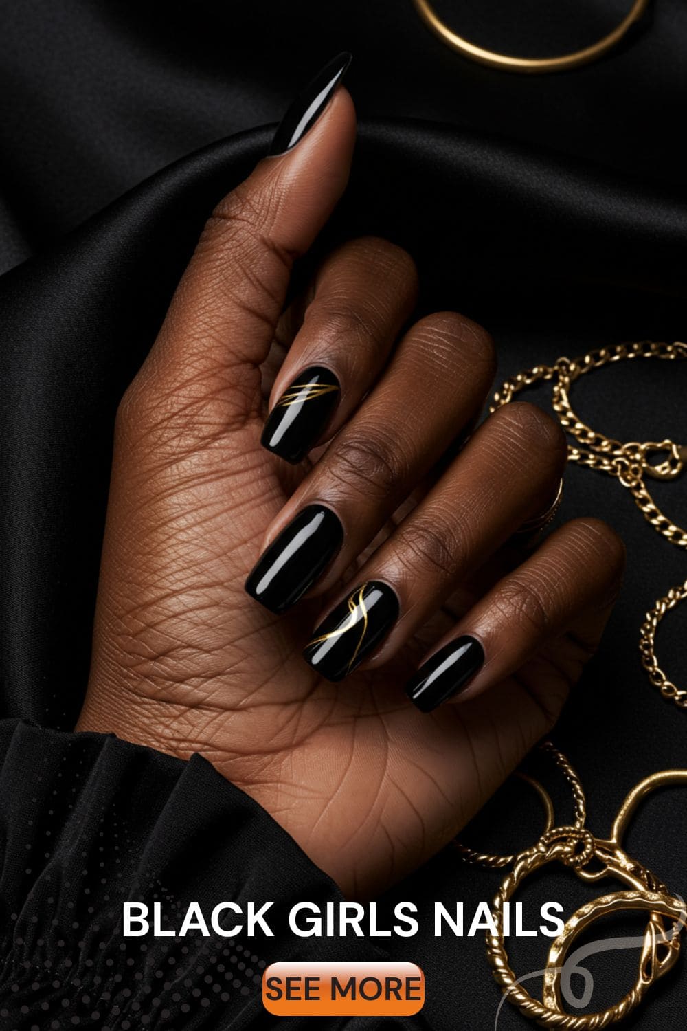 If youโre into edgy glam, this oneโs for you. Start with a glossy black base and layer on abstract gold line art or foil accents.