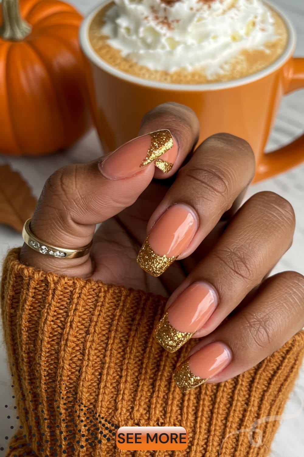 ๐ 7. Pumpkin Spice Nails with Glitter Tips