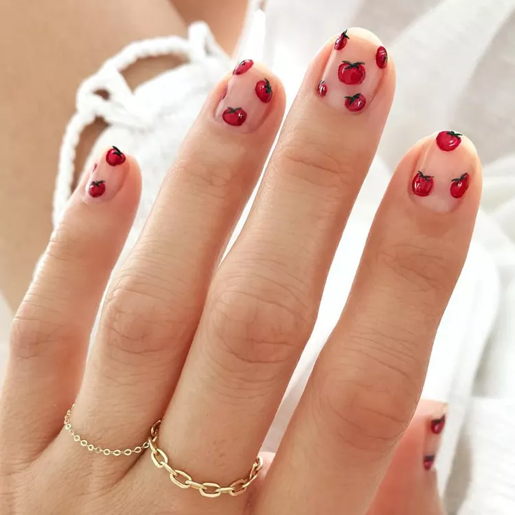 Tiny red tomato (or cherry) motifs on a neutral base give a sweet pop of color. Perfectly sized for short nails and playful without needing skills.