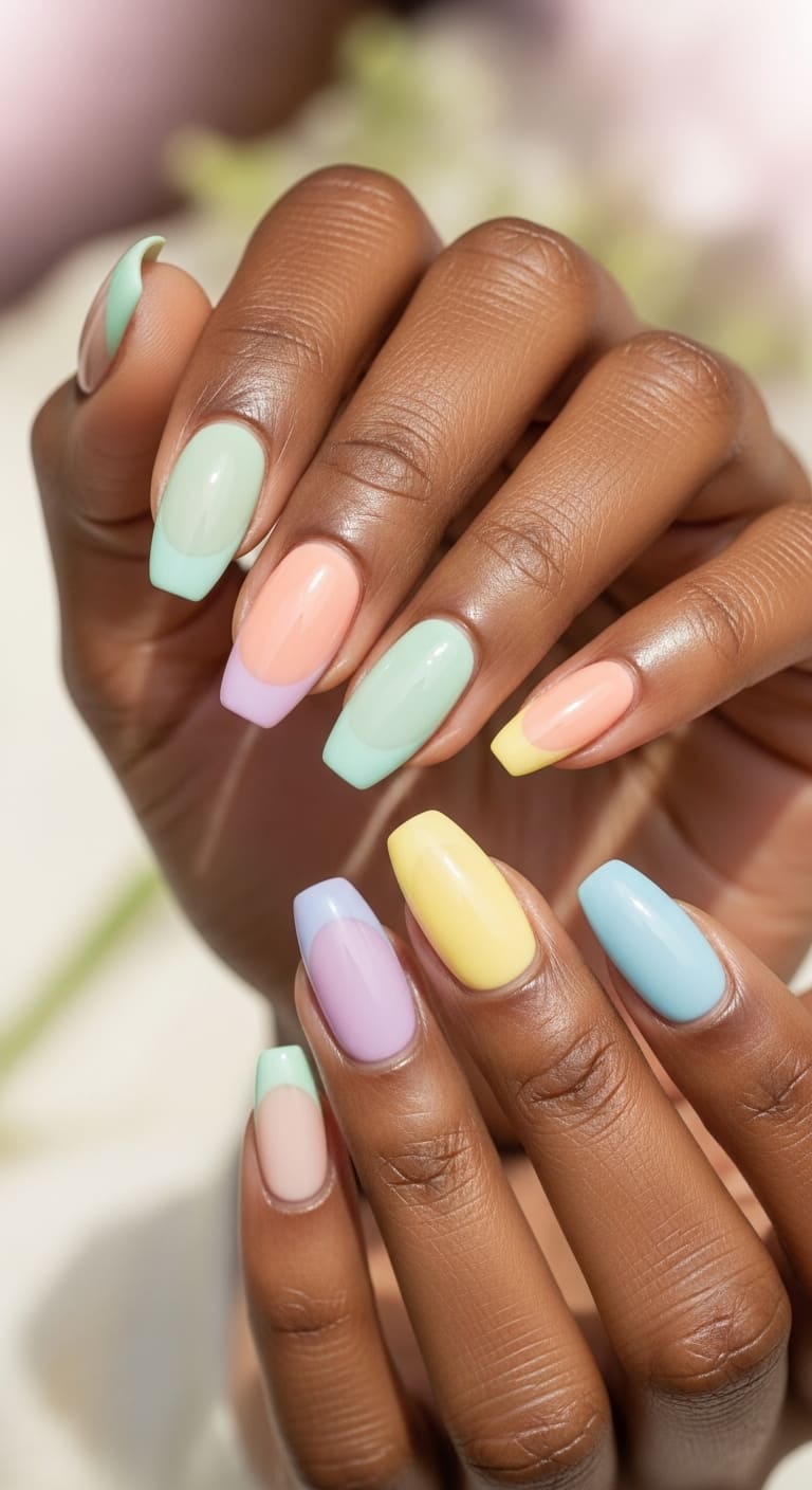 Rainbow tips are still going strong, but 2025 loves a muted pastel twist. Think soft gradients or each nail in a different shade—mint, peach, lilac, butter yellow.