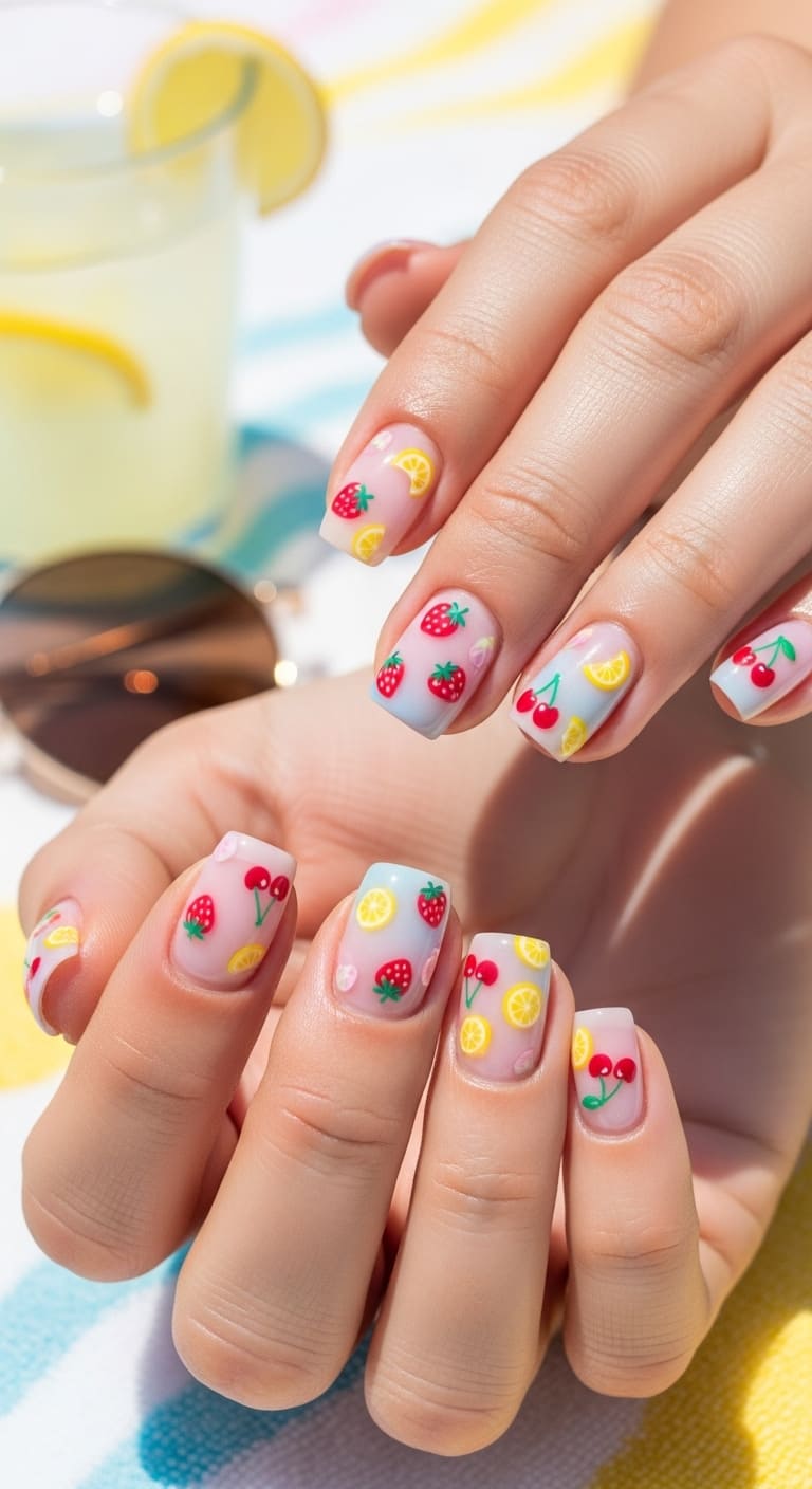 Whimsical fruit art—like mini strawberries, cherries, or lemons—is popping up everywhere this year. It adds a touch of summer playfulness to even the most basic manicure.
