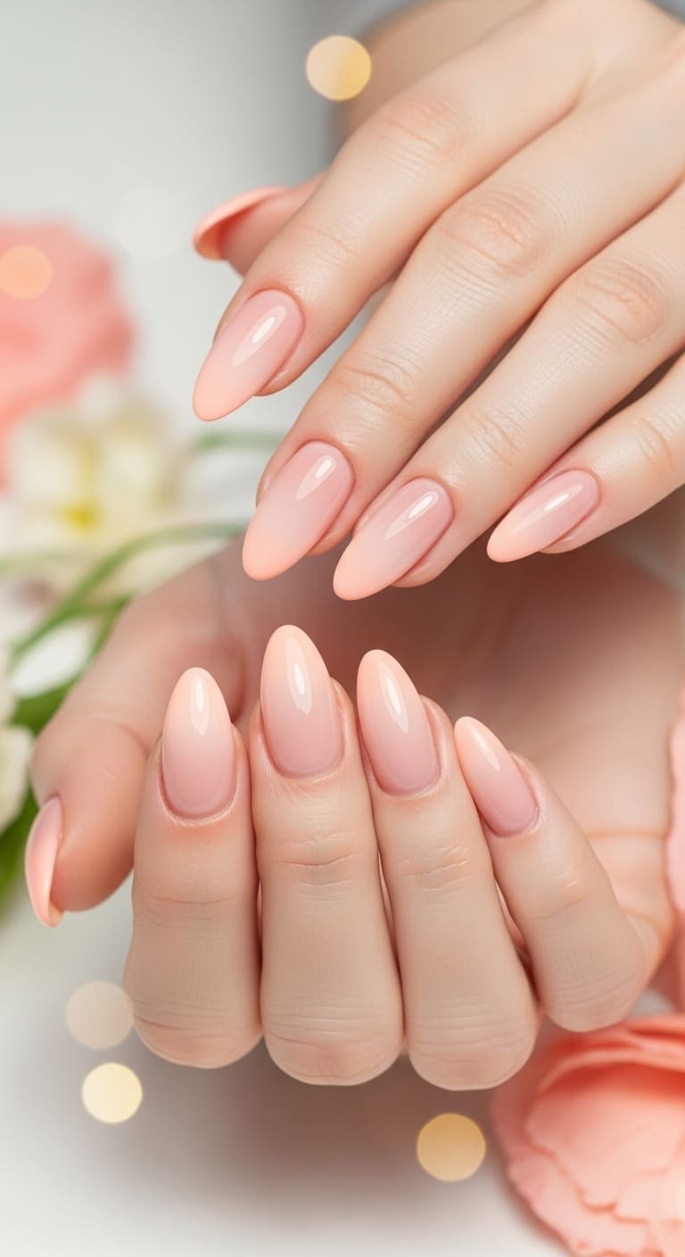 Ombré nails aren’t going anywhere, but this year favors soft, wearable colors like peach. The fade from sheer nude to pastel peach is delicate yet trendy.