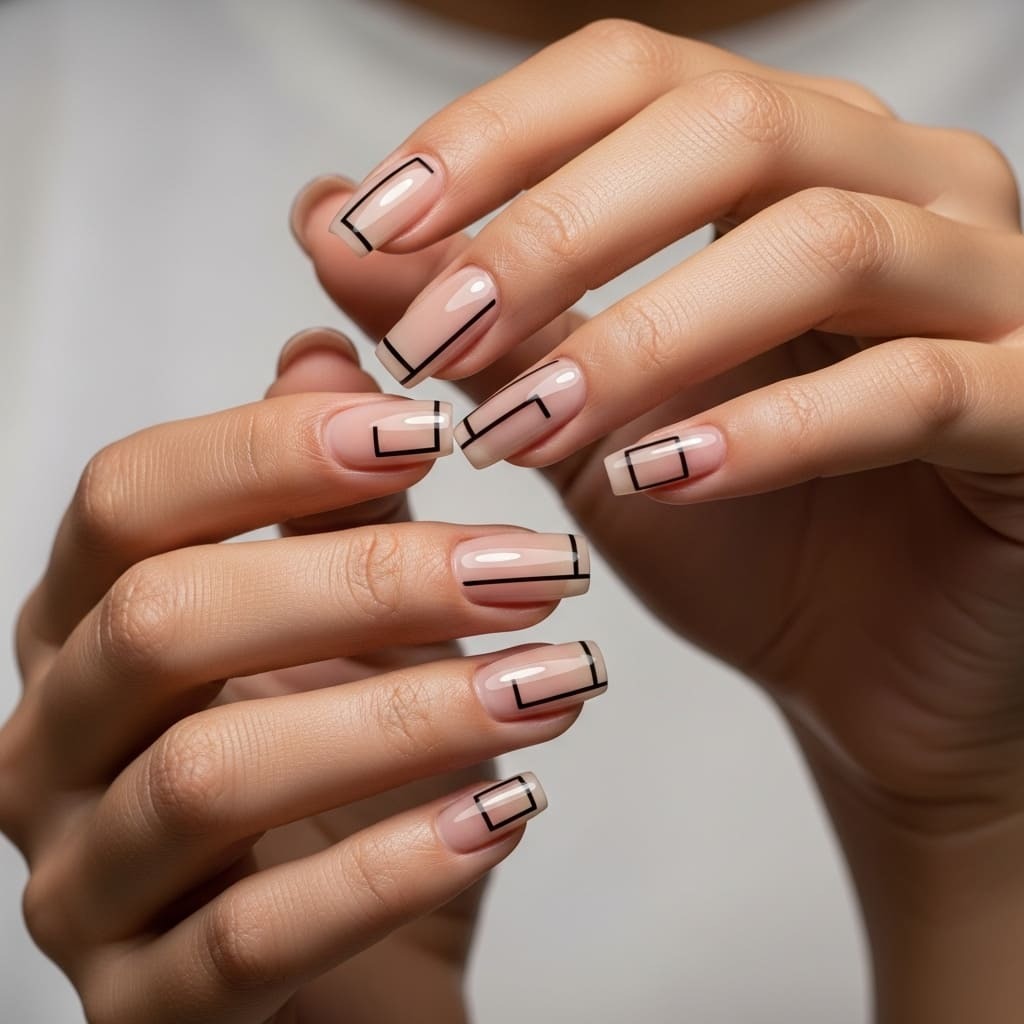 Graphic and cool, this design features sleek lines that “float” across the nail without touching the edges, thanks to clear or sheer backgrounds.