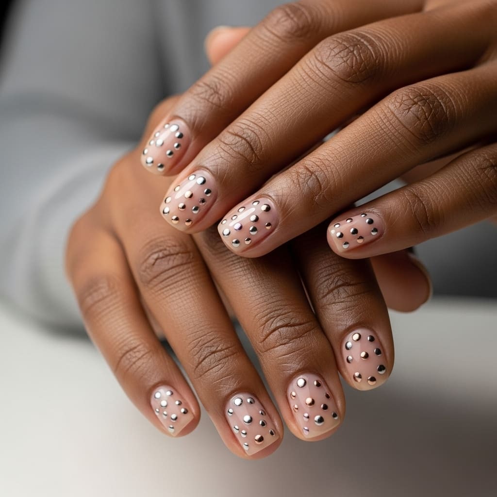 This is one of the easiest ways to dip into the chrome trend without going full-metal. Little chrome dots—silver, rose gold, or even lilac—on a clear or nude base look futuristic but minimal.